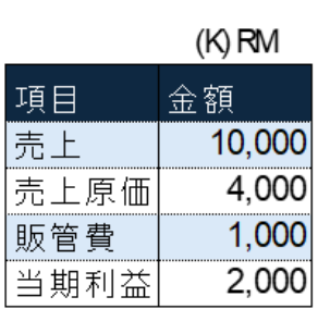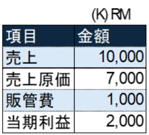そして、売上RM5,000K、売上原価RM3,500K販管費RM1,000K であったので、当期利益がRM500Kとなったことがわかります。