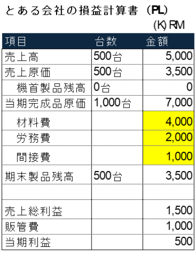 つまり今回のケースでは、1,000台生産するのに7,000K RM投入しているので、1台あたりの製造原価が7K RMだと会計上では認識します。